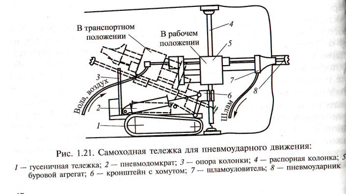 Рис. Самоходная тележка для пневмоударного движения. 1 - гусеничная тележка; 2 пневмодомкрат; 3- опорная колонка; 4- распорная колонка; 5- буровой агрегат; 6- кронштейн с хомутом; 7- шламоуловитель; 8 - пневмоударник.