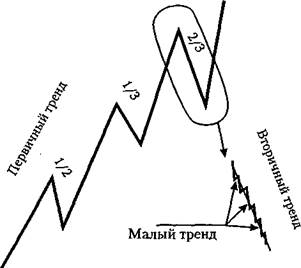 Рис. 1.5. Теория Доу: у рынка есть три тренда. Пример бычьего движения. Длина вторичного тренда составляет 1/2,1/3, 2/3 от длины первичного