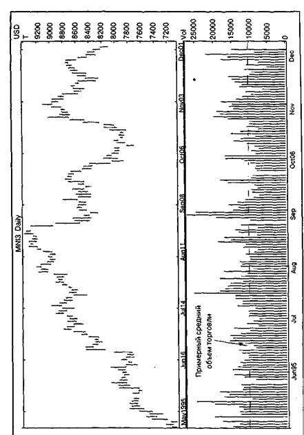 Рис. 1.8. Теория Доу: тренд цены на никель подтверждается объемом торговли График предоставлен агентством Reuter Тренд должен подтверждаться объемом торговли (рис.1.8). Доу признавал объем вторичным, но весьма важным фактором, влияющим на движение цены. Более просто этот принцип звучит так: объем должен повышаться в направлении главного тренда и понижаться в направлении корректирующем. Это положение по сей день используется почти всеми методами технического анализа как проверочное. 6. Тренд будет действовать, пока не подаст очевидных Как уже говорилось, этот принцип является основным при определении трендов вообще, хотя сами сигналы и различаются от метода к методу. На основании уже изученных принципов Теории Доу разворот тренда можно определить с помощью "приливной" методики. Понимание и оценка Теории Доу по достоинству создает прочный фундамент для изучения любого из методов технического анализа. Заключение Мы рассмотрели философию технического анализа, узнали о его зарождении и истории развития. На основании этих знаний уже можно начать заниматься практикой прогнозирования. Тем не менее следующая глава посвящена сравнению технического анализа с фундаментальным. Фундаментальный анализ в широком смысле занимается обычной причинно-следственной связью экономических событий и поэтому важен не только с точки зрения ежедневной работы, но и с точки зрения здравого смысла. Важно понять его место в общей системе прогнозирования и принятия решений. Возможно, следующая глава укрепит Вас в решении использовать технический анализ профессионально. Оставшаяся часть книги будет посвящена исключительно практике технического анализа — и для будущих аналитиков, и для трейдеров. Date: 2015-09-05; view: 545; Нарушение авторских прав |
