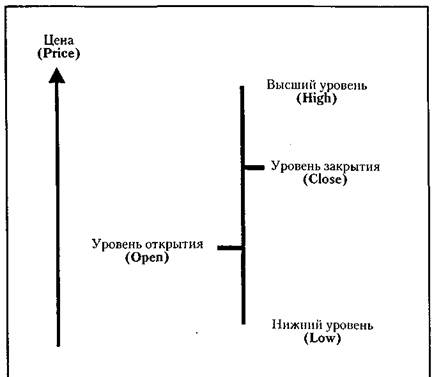Рис. 3.5. Ежедневный чарт-гистограмма движения курса Доллар США / Немецкая марка. График предоставлен агентством Reuter Гистограммы полезны своей репрезентативностью и помогают сделать наилучшие прогнозы с помощью классических трендовых и поворотных фигур, скользящих средних и т.д. Для любого метода, примененного к чарту-гистограмме, мы получим наибольшее количество сигналов и наиболее точное совпадение с расчетными ценовыми уровнями. Для построения палочки гистограммы (рис. 3.6) проводится вертикальная линия между высшей и низшей ценой рассматриваемого периода. Слева и справа изображаются маленькие отросточки, обозначающие цену открытия и закрытия соответственно.
