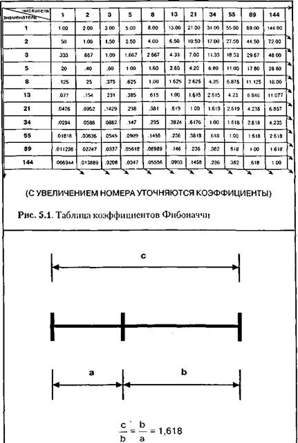 Леопард Фибоначчи (XII ~ XIIIв. н.э., Италия, Пиза) — один из И однако же — почему имя великого Фибоначчи неразрывно Причина заключается в так называемой числовой последова- телыности Фибоначчи, состоящей из цифр 1,1,2,3,5,8,13,21,34, 55, 89,144... Фибоначчи открыл се при наблюдении роста потомства у семьи кроликов. Задача была поставлена следующим образом: "Сколько кроликов, помещенных в клетку, можно получить в год от одной пары, если каждая пара производит новую каждый месяц, начиная со второго?" Каждое из чисел последовательности Фибоначчи представляет собой количество пар кроликов в каждый месяц соответственно своему порядковому номеру. Числовая последовательность Фибоначчи имеет много интересных свойств. Например, сумма двух соседних чисел последовательности дает значение следующего за ними (например, 1+1=2; 2+3=5 и т.д.). Интересующиеся темой особых свойств чисел в последовательности Фибоначчи могут найти ее освещение как в соответствующих математических трудах, так и в некоторых книгах по техническому анализу. Одним из самых главных следствий этих свойств является существование так называемых коэффициентов Фибоначчи, т.е. постоянных соотношений различных членов последовательности. Они определяются следующим образом: 1. Отношение каждого числа к последующему более и более · При делении каждого числа на следующее за ним через од- 2. Подбирая таким образом соотношения, получаем основной