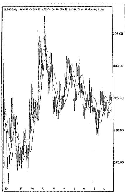 Одним из способов применения скользящих средних является построение фильтров. Этот метод альтернативен по отношению к использованию комбинации нескольких линий скользящих и направлен на минимизацию количества ложных сигналов. Вот некоторые из фильтров, которые можно установить для простой скользящей средней. Вариант 1. Для подтверждения изменения тренда после пересечения линии скользящей и графика между ними должно установиться расстояние, не меньшее пяти минимальных изменений цен. Например, на Лондонском рынке алюминия минимальное изменение цены составляет 50 центов; значит, минимальное различие после пересечения линий графика и скользящей должно составлять $2.50 (рис. 6.4). Вариант 2. Поскольку ложные сигналы обычно исчезают довольно быстро, некоторые трейдеры выжидают время для подтверждения нового тренда. Вариант 3. Конверты и полосы — удобные и наглядные фильтры. Для построения процентного конверта (рис. 6.5) на определенном расстоянии выше и ниже скользящей средней строят "параллельную" ей линию. Получаем дополнительные линии сопротивления или поддержки и требуем для подтверждения бычьего или медвежьего рынка, чтобы график цены находился соответственно выше или ниже всех трех созданных нами линий. Если же он колеблется между ними (в так называемой буферной зоне), никаких торговых решений принимать не следует. Вариант 4. Полоса (рис.. 6.6) создается построением одной и той же скользящей средней на основании высших и низших значений данного ценового графика вместо цен закрытия. Результат — две линии, похожие на только что описанный конверт. Верхняя из них служит линией тренда при медвежьем рынке, а нижняя — при бычьем; вместе они образуют что-то вроде канала.