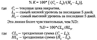Построенные таким образом стохастические линии называют быстрыми (Fast Stochastics). Некоторые трейдеры предпочитают использовать другую версию, т.е. медленные стохастические линии (Slow Stochastics). При этом несколько изменяются формулы для обеих кривых, но суть использования остается той же. Такая замена дней в формуле подобна использованию скользящих средних разных порядков.