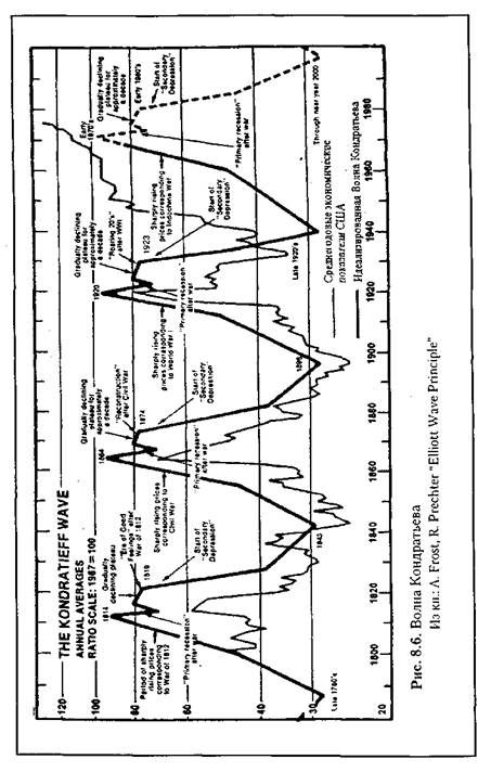 Не менее важным, чем определение периодичности цикла, является определение места возникновения его экстремума. Как мы помним, период цикла аналитики предпочитают измерять между его двумя нижними точками. Очевидно, что для идеально построенного цикла его максимум должен находиться точно в середине периода. Это явление, называемое консолидацией, в природе обычно не встречается. Как известно, трендовый (бычий или медвежий) рынок можно определить как тот, в котором движения цены вверх или вниз соответственно являются более сильными и успешными, чем противоположные. Это определение говорит об амплитудных закономерностях. Если сформулировать это определение с точки зрения фактора времени, получим утверждение о том, что в бычьем рынке движение вверх длится дольше, чем движение вниз. Для медвежьего рынка справедливо обратное утверждение.