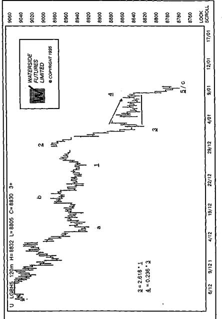 Рис. 9.13. Правило Чередования: волна 2 — зигзаг; волна 4 — нисходящий треугольник Иллюстрация прсдоставлена фирмой Waterside Futures LTD
