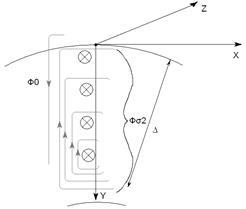 Дещо спрощено поверхневий ефект можна пояснити значними потоками розсіяння Фs2 вихрових струмів феромагнітного масиву ротора. Якщо виділити в цьому масиві елементарний стрижень – “активний провідник обмотки” ротора (рис. 4), то як випливає з цього рисунку для нижніх його волокон потокозчеплення зі “своїми” потоками Фs2-yФs2 є більшим від потокозчеплення yФs2 верхніх волокон. Тому сумарна ЕРС нижніх волокон “стрижня” еснв є менша від відповідної ЕРС його верхніх волокон есвв