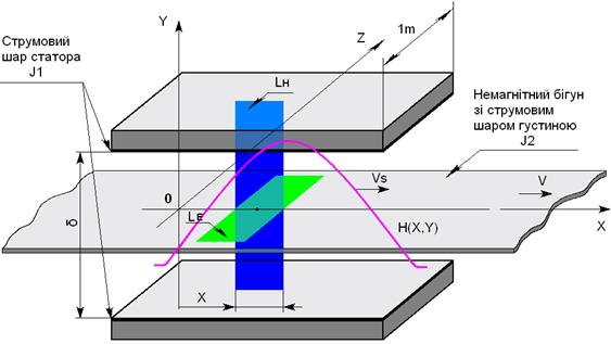 Рис.6. Модель ЛАД з поперечним полем та з немагнітним бігуном Користуючись цією моделлю ЛАД складемо рівняння Максвела машини в диференційній формі, використовуючи кординатну систему