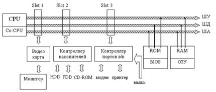 Узлы и блоки ПК Информационно-логическая архитектура ПК Архитектура ПК – это состав и соединение составляющих функциональных блоков. Это абстрактное представление ЭВМ, которое отражает ее структурную, схемотехническую. И логическую организацию. Архитектура определяется совокупностью ее основных свойств, существенных для пользователя. Основное внимание уделяется структуре и функциональным возможностям машины, которые можно разделить на: основные и дополнительные. Основные функции повышают эффективность выполнения основных функций: обмен информацией с внешними объектами. Дополнительные функции повышают эффективность выполнения основных функций: обеспечивают эффективные приемы работы, диалог пользователем, систему подсказок и др. Эти функции выполняются с помощью аппаратных и программных средств ПК. Понятие архитектуры включает в себя: · Структурную схему ЭВМ; · Средства и способы доступа к элементам структурной схемы ЭВМ; · Организацию и разрядность интерфейсов ЭВМ; · Набор и доступность регистров; · Организацию и способы адресации памяти; · Способы представления и форматы данных ЭВМ; · Набор машинных команд ЭВМ; · Форматы машинных команд; · Обработку нештатных ситуаций (прерываний).