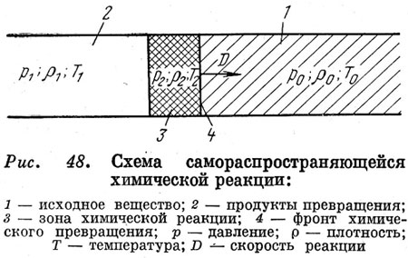 При химическом взрыве энергия выделяется в результате быстрой химической реакции. Этому типу взрыва можно дать следующее определение: взрывом называется быстрое химическое превращение взрывчатого вещества, протекающее с выделением тепла и образованием газов. Из этого определения вытекают четыре основных условия, которым должна удовлетворять химическая реакция для того, чтобы она могла протекать в форме взрыва: · экзотермичность (выделение тепла), · образование газов, · большая скорость реакции,, · способность к самораспространению. Если хотя бы одно из этих условий не выполняется — взрыва не произойдет. Химическое превращение взрывчатых веществ и смесей может протекать в различных формах, основными из которых являются: · медленное химическое превращение (разложение вещества); · горение; · детонация. При медленном химическом превращении реакция разложения протекает одновременно во всем объеме вещества, находящимся при одинаковой температуре, практически равной температуре окружающей среды. Скорость реакции соответствует этой температуре и во всех точках масса ВВ одинакова. При нагревании ВВ его температура возрастает не только за счет внешнего нагрева, но и за счет тепла, выделяющегося при химической реакции разложения. При определенных условиях эта реакция может стать самоускоряющейся, в результате чего ВВ быстро превратится в сжатые газы почти одновременно по всему объему. Произойдет тепловой взрыв ВВ, который может служить примером гомогенного (однородного) взрыва. Однако практически гомогенный взрыв неосуществим из-за неравномерного теплоотвода из ВВ, так как в веществе всегда имеет место возникновение одного или нескольких очагов горения, из которых горение затем распространяется на остальную массу ВВ. Основой современной взрывной техники является использование самораспространяющегося взрывчатого превращения. При этой форме взрыва химическое превращение, начавшееся в какой-либо точке заряда, самопроизвольно распространяется до его границ. Способность химической реакции в самораспространению, является, характерной особенностью этой формы взрыва. Самораспространяющееся взрывчатое превращение возможно при горении и детонации ВВ. В обоих случаях имеется фронт химического превращения — относительно узкая зона, в которой происходит интенсивная химическая реакция, распространяющаяся по веществу с некоторой скоростью. Впереди этой зоны находится исходное ВВ, позади нее — продукты превращения Температуры впереди фронта, позади него и в самой зоне химической реакции существенно различаются; имеет место также неравенство давлений и плотности. Скорость реакции, точнее, линейная скорость перемещения фронта процесса зависит в основном не от начальной температуры вещества, а от количества выделяющейся при реакции энергии, условий передачи ее непрореагировавшему веществу и кинетических характеристик возникающего в нем при этой передаче химического превращения. Так как механизм передачи энергии при горении и детонации различен (при горении тепловая энергия передается за счет теплопроводности, при детонации основную роль играет ударная волна), скорость распространения процесса также различается и при горении не превышает для конденсированных ВВ нескольких сантиметров в секунду, а при детон