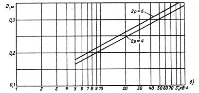 Проектирование синхронных машин, как, впрочем, и любой другой электрической машины, начинают с выбора главных размеров: внутреннего диаметра статора и расчетной длины . Задача эта не имеет однозначного решения, так как при выборе главных размеров приходится учитывать ряд требований. Поэтому для нахождения оптимальных значений и приходится в некоторых случаях просчитывать ряд вариантов. Для сокращения числа рассчитываемых вариантов целесообразно воспользоваться рекомендациями, полученными на основе накопленного опыта проектирования и эксплуатации подобных машин. Для предварительного определения диаметра можно воспользоваться построенными в логарифмическом масштабе зависимостями (рис. 10.8), которые соответствуют усредненным диаметрам выполненных машин.