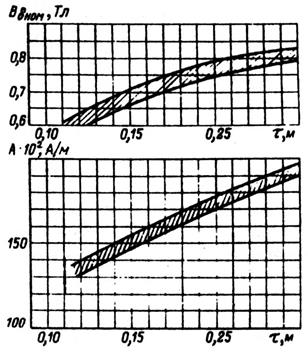 От зависят ряд показателей машины и условия ее охлаждения. Чем длиннее машина (больше ), тем хуже условия ее охлаждения. Значение для выпускаемых в настоящее время синхронных машин обычно лежит в пределах, указанных на рис. 10.11. Если не укладывается в указанные пределы, то следует изменить диаметр , а если потребуется, то и внешний диаметр . При изменении диаметра в соответствии с (10.5) изменится и .