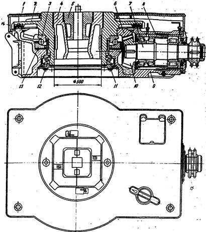 Рис. 7. 1. Буровой ротор УР-560 ее определяются конструктивными, эксплуатационными, технологическими и эстетическими требованиями. В станине имеются горизонтальная и вертикальная расточки для размещения быстроходного вала и стола ротора. Толщина ее стенок 15—30 мм. Следует иметь в виду, что увеличение толщины стенок приводит к неоднородности микроструктуры металла из-за возрастающей разности скоростей охлаждения сердцевины и поверхностного слоя отливки. Поэтому для получения качественных отливок толщина стенок станины ротора выбирается, с учетом требований технологии литейного производства. Необходимую прочность и жесткость придают ребра на внутренних стенках станины. В основании ее имеются отверстия для стропов, используемых для перемещения ротора в подвешенном состоянии. Стол 2 ротора. представляет собой полую стальную отливку с наружным диском, прикрывающим вертикальную расточку станины. В верхней части он имеет квадратное углубление для разъемного вкладыша (втулки) 4. В свою очередь, вкладыши имеют квадратное углубление для зажима 5, переходящее в конус. При бурении во вкладыши вставляются квадратные либо роликовые зажимы ведущей трубы, а при спуско-подъемных операциях — клинья, удерживающие колонну труб над ротором. Разъемная конструкция вкладышей и зажимов обеспечивает установку их в ротор в тех случаях, когда его отверстие занято трубой. Втулки и зажимы удерживаются в роторе при помощи поворотных защелок. Между зажимом и ведущей трубой возникает трение скольжения, вызывающее износ поверхностей их контакта. При использовании роликовых зажимов ведущая труба перекатывается по роликам, установленным на подшипниках качения, и благодаря этому ее износ значительно снижается. Стол ротора с напрессованным коническим колесом, устанавливается в вертикальной расточке станины на основной 3 и вспомогательной 12 опорах. В качестве опор используются упорно-радиальные шариковые подшипники, которые вследствие зеркального расположения и осевой затяжки способны воспринимать двусторонние осевые нагрузки. На основную опору действуют собственный вес стола ротора и колонны труб, удерживаемой им при спуско-подъемных операциях. В процессе бурения скважины бурильная колонна подвешивается к вертлюгу и на основную опору действуют собственный вес стола и силы трения,, возникающие в результате скольжения ведущей трубы относительно зажимов 5 ротора. Подшипники и стол ротора вращаются при роторном бурении и остаются неподвижными при спуско-подъемных операциях и бурении забойными двигателями, если не учитывать их вращения при периодическом проворачивании бурильной колонны с целью предупреждения прихватов. На вспомогательную опору действуют усилие от предварительного осевого натяга подшипника и случайные нагрузки от трения и ударов, возникающие при подъеме труб, долота и другого инструмента в результате их раскачивания и смещения относительно оси стола ротора. Важное значение для нормальной работы ротора имеет осевой предварительный натяг вспомогательного подшипника. Правильно выбранный натяг обеспечивает плотное прилегание шариков к беговым дорожкам, уменьшает износ поверхностей качения, повышает долговечность и нагружаемость подшипников, предупреждает вращение шариков под действием гироскопических моментов,