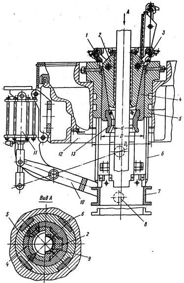 Рис. 7.5. Пневматический клиновой захват ПКР-560 Вес бурильной колонны, удерживаемой клиновым захватом, ограничивается допускаемым контактным давлением между плашками и телом трубы. Для снижения контактных давлении пользуются удлиненными клиньями и специальными плашками, охватывающими трубу с минимальным зазором между их продольными торцами. В некоторых конструкциях вместо трех используется шесть клиньев, что способствует более равномерному распределению контактных давлений. При недостаточной удерживающей способности клиновые захваты заменяются подкладным кольцом (рис. 7.6, а) для установки элеватора либо подкладными клиньями, удерживающими трубу за торец муфты. Для спуска