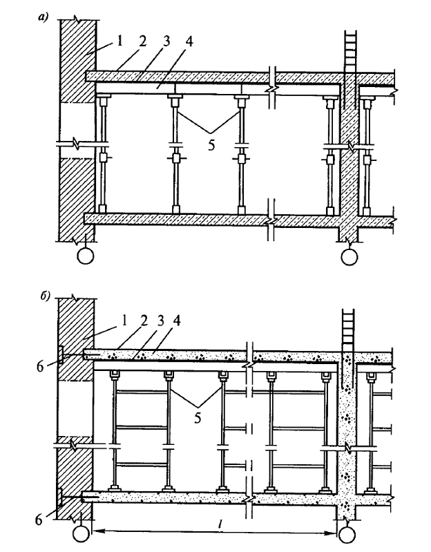 Монолитные перекрытия. При реконструкции зданий криволинейной и сложной формы, когда применение сборных конструкций перекрытий сопряжено с использованием большого числа доборных элементов и монолитных участков, может быть рекомендовано монолитное перекрытие. Эта рекомендация базируется на индустриальности монолитных систем, адаптированных к различным технологическим условиям, а также на механизации процессов транспортирования, укладки и уплотнения бетонной смеси. • подготовительные работы по пробивке штраб, усилению или замене отдельных участков кладки;