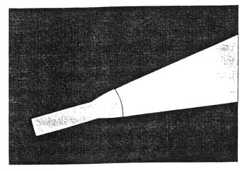 Рис. 2.1. Свет от электрического фонарика Представьте включенный электрический фонарик в темной комнате где нет других источников освещения. Нить накала лампочки испускает свет, который расширяется, образуя часть конуса. Чтобы не усложнять эксперимент отраженным светом, стены комнаты должны быть матово‑черными для полного поглощения света. Или, поскольку мы проводим эти эксперименты только в своем воображении, можно представить комнату астрономических размеров, чтобы до завершения эксперимента свет не успел достигнуть стен и вернуться. Рисунок 2.1 иллюстрирует данный опыт. Но этот рисунок в некоторой степени не соответствует истине: если бы мы смотрели на фонарик со стороны, мы не смогли бы увидеть ни фонарик, ни свет. Невидимость – одно из простейших свойств света. Мы видим свет лишь тогда, когда он попадает в наши глаза (хотя, как правило, мы говорим о последнем объекте, на который воздействовал этот свет и который оказался по линии нашего зрения). Мы не можем увидеть свет, который просто проходит мимо. Если бы в луче оказался отражающий объект или даже пыль или капельки воды, чтобы рассеять свет, мы смогли бы его увидеть. Но поскольку в луче ничего нет, и мы смотрим на него извне, его свет не достигает нас. Наиболее точно то, что мы должны увидеть, следовало бы представить абсолютно черной картинкой. В присутствии второго источника света, мы могли бы увидеть фонарик, но опять же не его свет. Лучи света, даже самого интенсивного света, который мы можем получить (с помощью лазеров), проходят друг через друга, как если бы ничего не было вообще. На рисунке 2.1 видно, что около фонарика свет наиболее яркий, по мере удаления от него свет тускнеет, так как луч расширяется, чтобы осветить еще большую площадь. Наблюдателю, находящемуся в луче и отходящему от фонарика спиной вперед, рефлектор показался бы еще меньше, а когда был бы виден только как точка, еще слабее. Это в самом деле было бы так? Способен ли свет действительно распространяться неограниченно все более тонкими лучами? Ответ: нет. На расстоянии примерно десяти тысяч километров от фонарика его свет был бы слишком слабым, чтобы человеческий глаз мог его различить, и наблюдатель ничего бы не увидел. То есть человек ничего бы не увидел; а животное с более чувствительным зрением? Глаза лягушки в несколько раз чувствительнее человеческих глаз: этого вполне достаточно, чтобы почувствовать ощутимую разницу при проведении эксперимента. Если бы наблюдателем была лягушка, и она удалялась бы от электрического фонарика, момент, когда она полностью потеряла бы его из вида, никогда бы не наступил. Вместо этого лягушка увидела бы, что фонарик начал мерцать. Вспышки возникали бы через неравные промежутки времени, которые увеличивались бы по мере удаления лягушки от фонарика. Но отдельные вспышки не стали бы менее яркими. На расстоянии ста миллионов километров от фонарика лягушка видела бы в среднем только одну вспышку света в день, но эта вспышка была бы не менее яркой, чем любая другая, наблюдаемая с любого другого расстояния.