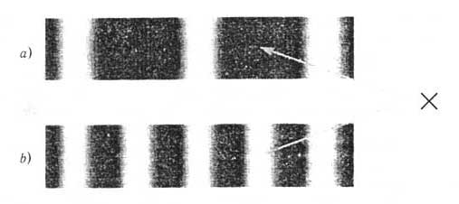 Рис. 2.7. Тени отбрасываемые перегородкой с (а) четырьмя и (b) двумя параллельными щелями Таким образом, появление еще двух источников света затемняет точку X. а их удаление снова освещает ее. Каким образом? Можно представить два фотона, направляющиеся к точке Х и отскакивающие друг от друга как бильярдные шары. Только один из фотонов мог бы попасть в точку X, но они мешали друг другу, и потому ни один из них туда не попал. Скоро я покажу, что это объяснение не может быть истинным. Тем не менее, основной идеи избежать невозможно: через вторую пару щелей должно проходить что‑то, препятствующее попаданию света из первой пары щелей в точку X. Но что? Это мы можем выяснить с помощью дальнейших экспериментов. Во‑первых, картина тени от перегородки с четырьмя щелями, изображенная на рисунке 2.7 (а), появляется только в том случае, если все четыре щели освещены лазерным лучом. Если освещены только две щели, появляется картина, соответствующая тени от двух щелей Еcли освещены три щели, появится картина тени от трех щелей которая в свою очередь будет отличаться от двух предыдущих. Таким образом, в луче света находится нечто, вызывающее интерференцию Картина тени от двух щелей также появляется, если две щели заполнить светонепроницаемым материалом, но она изменяется при заполнении этих щелей прозрачным материалом. Другими словами, интерференции препятствует нечто, препятствующее свету, это может быть даже что‑то столь же несущественное, как туман. Но оно может пройти через все, что пропускает свет, даже через непроницаемый (для материи) алмаз. Если в аппарате расположить сложную систему зеркал и линз так, чтобы свет мог распространяться от каждой щели до конкретной точки на экране, то в этой точке наблюдалась бы часть картины тени от четырех щелей. Если конкретной точки достигает свет только от двух щелей, на экране мы увидим часть картины тени от двух щелей и т.д. Таким образом, что бы ни вызывало интерференцию, оно ведет себя как свет. Оно присутствует в луче света, но отсутствует вне него. Оно отражается, передается или блокируется тем, что отражает, передает или блокирует свет. Возможно, вы удивитесь, почему я столь досконально разбираю этот вопрос. Абсолютно очевидно, что это свет то есть фотонам из одной щели мешают фотоны из других. Но, возможно вы поставите под сомнение очевидное после следующего эксперимента, расшифровки спектров. Что нам ожидать при проведении этих экспериментов только с од ним фотоном? Например, предположим, что наш фонарик расположен так далеко от экрана, что за целый день на экран попадает только один фотон. Что увидит наша лягушка, наблюдающая за экраном? Если то, что каждому фотону мешают другие фотоны, – правда, то не уменьшится ли интерференция, когда фотоны будут появляться реже? Не прекратится ли она вовсе, если через аппарат за раз будет проходить только один фотон? Мы по‑прежнему можем ожидать появления полутеней, т. к. фотон при прохождении через щель может отклониться от своего курса (например, ударившись о край щели). Но на экране мы точно не должны увидеть участок, подобный точке X, который получает фотоны, когда открыты две щели, и становится темным когда открывают две другие. Однако именно это мы и наблюдаем. Независимо от того, насколько редко появляются фотоны, картина тени остается неизменной. Даже при провед