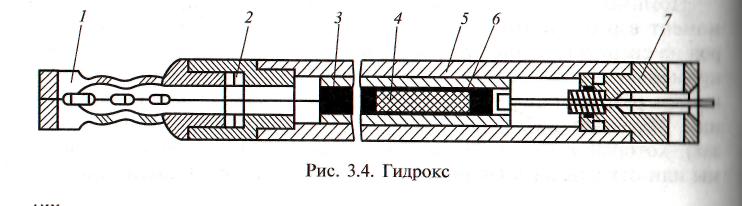 Рис. Патрон гидрокс · аэрдокс В патронах аэрдокс источником потенциальной энергии является сжатый воздух высокого давления. Патрон состоит из стальной трубы 2, разрядной головки 5 с выхлопными окнами 4, штуцера 1 для подключения к воздушной сети и запорного диска I. Длина патрона 1,1…2,3 м, диаметр 42…63 мм. Шпуры бурят: на 0,2…0,8 м короче патрона. Последний закладывают в шпур, затем специальным шлангом соединяют его с воздухопроводом и подают в патрон сжатый воздух под давлением 30…70 Мпа. Для взрыва следующего шпура необходимо вставить новый запорный диск и подать в патрон новую порцию сжатого воздуха.