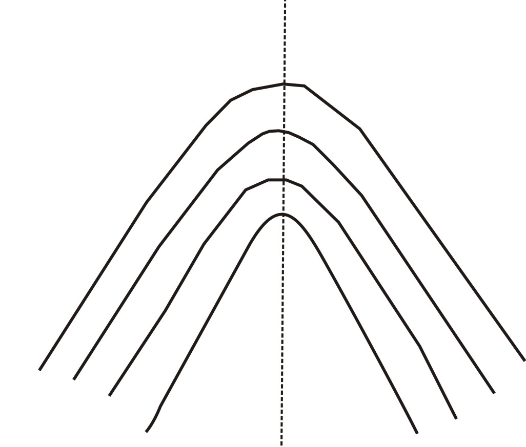 B) Көлбеу қабаттар түйісуі $$$ 38 Стратиграфиялық үйлесімсіздіктің негізгі айшықты белгісі. A) Үстіңгі және астыңғы қабаттар фауналар жасының айырмашылығы $$$ 40 Суретте қандай қатпар түрі көрсетілген.
