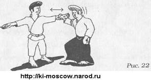 Во втором случае тело распрямлено, но зажато, а мускулы напряжены, с вытекающим отсюда ограничением движений головы, шеи, плеч и груди (рис. 20). Третий пример - это правильная вертикальная позиция тела, когда таз и позвоночник сбалансированы на стабильной вертикальной линии, а шея, голова и конечности двигаются свободно, как им нужно; плечи расслаблены, человек в целом производит впечатление устойчивости (рис. 21). Эти варианты - типичные примеры, выбранные просто для того, чтобы описать три крайних типа позиций. Стоит заметить, что люди, стремящиеся улучшить свою осанку, обычно переходят от первого ко второму типу осанки, минуя естественное положение третьего типа, поэтому большинство людей сохраняют именно первое или второе положение тела. Я рано обнаружил, что можно легко на время исправить неправильную осанку, применяя четыре принципа объединения сознания и тела. Однако я также обнаружил, что человеку трудно сохранять правильную осанку в течение долгого времени, потому что ему свойственна тенденция к возвращению привычной осанки. Осанка - это результат «осаночной адаптации», к которой человек пришел в итоге, не только в результате филогенетических и онтогенетических процессов, а также благодаря адаптации к окружающей среде. На нашу осанку повлияли наши взаимоотношения с окружающим миром, которые могут быть диалогом, борьбой или компромиссом. Следовательно, то, какую осанку мы будем иметь, зависит от характера этих взаимоотношений с другими и от того, какое положение мы завоевали (или приняли) в окружающем нас мире. Три типичных примера осанки, описанных выше, являются также примерами возможных взаимоотношений с окружающим миром. Первые два примера выражают конфликтные отношения (защищенность на себе в первом случае и агрессивная защита - во втором), а третий пример означает отношения, базирующиеся на диалоге и компромиссе с окружающим миром. Первые два случая связаны с состоянием страха и отсутствием уверенности в себе, что приводит к агрессивному подходу (против себя - в первую очередь, против остальных - во вторую). Чтобы восстановить равновесие осанки, необходимо найти безопасную Одну Точку, которая могла бы гарантировать хорошие взаимоотношения со средой. Изучение и понимание четырех принципов Ки может предложить такую безопасную Одну Точку, улучшающую наше физическое и психологическое равновесие. Для начала, достаточно научиться использовать один-единственный принцип, чтобы достигнуть чувства спокойствия и стабильности. Если, например, вы опробуете тест на удержание Одной Точки (как показано на рис. 1 и 2), удержать равновесие вам будет довольно легко. Но если вы возьметесь за более трудные уровни тестирования, когда партнер старается захватить и отвлечь ваше внимание, трудно будет пройти тест при неправильной осанке. Тренируясь в додзё, вы часто можете пройти тест, но как только вы уходите из додзё и оказываетесь в иных окружениях и ситуациях, вы чувствуете себя слабым и неуравновешенным, вас мучает чувство покинутости и напряжения во всем теле. Вы всегда должны помнить про взаимоотношения с окружающим пространством. Это гораздо важнее, чем взаимоотношения с другими людьми. В предыдущем тесте ситуация менялась, когда менялось отношение партнера. Если не концентрировать внимание на партнере, проводящем провер
