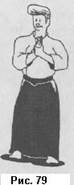 Эти три первых упражнения используются для мобилизации кистей и запястий. Они также важны при изучении использования полной релаксации рук и кистей, в качестве проверки силы. Если вы попробуете вывернуть запястье с напряжением, помимо боли, вы потеряете равновесие тела, потому что мускулы ваши будут напряжены и вы не сможете удержать Одну Точку. Если же вы будете просто делать движения, не пытаясь вывернуть запястье, это будет идеальным упражнением для развития Ки. Во время первого упражнения нужно двигать локтями к полу, продолжая расширять Ки из кончиков пальцев, как показано на рис. 78. Таким образом, вы достигнете подвижности запястья, максимально используя его эластичность и удерживая его расслабленным, без напряжения. Во втором упражнении вы должны согнуть запястье, не давя большим пальцем на тыльную часть руки, и двигать рукой вертикально по отношению к полу (рис. 79). В третьем случае (рис. 80) нужно вытягивать руки, не выворачивая кистей и без дополнительного напряжения в руках, пока не будет достигнуто естественное для них положение. Если вы выполните все упражнения описанным образом, вы сможете пройти все тесты по толчкам кистей и рук, когда невозможно становится поднять руку (тест по удержанию веса внизу), а тело сдвинуть (тест на сохранение Одной Точки).