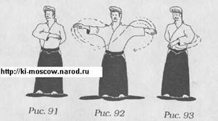 8. Удефури ваза Нужно, чтобы руки были полностью расслаблены, поскольку они должны будут совершить большое сильное вращение (см. рис. 91-93). Вы можете проверить правильность упражнения двумя тестами. В первом попросите партнера надавить вам на плечо сбоку, когда руки закончат вращение (рис. 93). Во втором партнер должен стоять сбоку от вас во время вращения таким образом, чтобы быть вам препятствием. Если Одна Точка у вас действительно в центре, а руки расслаблены, ваша рука сможет мягко отодвинуть партнера, особенно если вы устойчиво используете движение другой руки. Иначе, при заблокированной руке, вы потеряете равновесие, сместившись вперед.