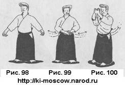 9. Удефури Чояка ваза Это продолжение предыдущего упражнения. Из позиции, показанной на рис. 94, выставьте левую ногу вперед, горизонтально раскачивая руками относительно пола (рис, 95), и, в результате вращения, вы, как показано на рис. 96, будете стоять теперь, выставив вперед правую ногу. В этом вращении вы двигались по линии, полностью изменяя направление взгляда и тела. Если вы хотите перепроверить себя, попросите партнера в конце движения толкнуть вас в правое плечо (рис. 97), чтобы удостовериться в том, что Ки все еще направлено вперед, а руки полностью расслаблены.