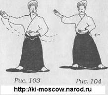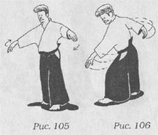 11. Саю ваза Как и в некоторых предыдущих упражнениях (Фунекоей ваза и Иккё, в которых вы двигались вперед), в Саю ваза, включающем боковое движение, также важно не двигать плечом, позволяя движению начаться от бедер, таким образом, чтобы Одна Точка была направляющей. Сперва раскачайте руки, как показано на рис. 101, потом, когда они полностью остановятся, завершите движением вбок, как на рис. 102. Чтобы сдвинуться, вам придется согнуть левое колено, при этом не приседая. Через некоторое время, тестированием с помощью толчка в правое плечо в направлении движения, проверьте, полностью ли расслаблены руки и правильна ли поза. Проделайте то же движение в обратном направлении (см. рис. 103, 104). Таким образом, все упражнение будет делиться на четыре фазы: 1) раскачивание рук влево, 2) движение бедрами влево, 3) раскачивание рук вправо, с возвращением бедер в исходную позицию, 4) движение вправо.