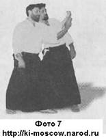 18. Ирими ваза Означает изменение направления Ки партнера, за которым следует изменение положения его тела. Из исходного положения (фото 1) поднимите пальцы вверх и коснитесь ладони партнера тыльной стороной своей кисти в целях устранения эластичности его руки, согласно принципу Нидан-бики. Расширяя свое Ки вперед, продвиньте вперед левую ногу, не сгибая своей руки и не толкая руки партнера. Если ваше сознание способно проецироваться за пределы вашего партнера, не концентрируясь на нем, вы сможете изменить направление его сознания и развернуть его тело (фото 7).