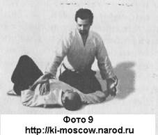 На высших ступенях Син Син Тоитсу Айкидо мы начинаем изучение Рандори, включенного в программу экзамена, начиная с первого дана (первая степень черного пояса) и выше. Рандори имеет дело с несколькими атакующими (четырьмя или пятью), которые наступают с разных сторон; здесь важно не концентрировать сознание ни на атакующих, ни на техниках. Вы должны сохранять способность быстро двигаться внутри пространства, всегда сохраняя Одну Точку в его центре и поддерживая гармонию со всем и всеми, кто находится в пределах этого пространства; двигайтесь легко и помните об ответственности при управлении. Применяя принципы Фудошин, вы сохраните непоколебимость и твердость духа и прочувствуете полное восприятие пространства даже в движении. Поскольку эта практика сложна, до ее начала следует выполнить серию упражнений, ведущих к более эффективному выполнению Рандори. Постигнув все техники Ки-Айкидо, вы должны их забыть, поскольку в Рандори нет времени на их исполнение: вы должны быть неожиданно исчезающей целью, которая в то же время заставляет атакующих падать. Рандори, таким образом, кажется просто чудом: поэтому я бы предложил несколько упражнений для его лучшего понимания. Первое упражнение похоже на игру в которой надо научиться быстро двигаться в ограниченном пространстве с большим количеством людей вокруг. Группа людей располагается вдоль границ заданной области и по команде начинает быстро хаотично двигаться, избегая касаться друг друга. Скорее всего, вначале произойдет много столкновений, но, достигнув периферийного видения, после нескольких попыток вы сможете быстро двигаться во всех направлениях, ни с кем не сталкиваясь. Во втором упражнении встаньте перед группой людей, выстроенных в линию, которые будут приближаться к вам один за другим, чтобы захватить вас за плечи. Вам придется сдвинуться в сторону, не дав коснуться себя, чтобы ваши партнеры могли продолжать двигаться в своем направлении. И так же следует тренироваться с партнерами, двигающимися в любом направлении. В этом случае важно уметь не концентрироваться на отдельном партнере, а поддерживать восприятие всего окружающего пространства. Но всего этого еще недостаточно, поскольку цель - заставить атакующих упасть, чтобы иметь больше времени на контролирование окружающего пространства. Рандори считается успешным, когда за короткое время все нападающие повержены на землю или отброшены далеко. Чтобы научиться двигать партнера (чтобы в итоге направить его) без «намерения», существует трудное, но очень полезное упражнение - Кокю Доса. Сядьте с партнером в позу сейза, лицом друг к другу, и пусть он держит вас за запястья, как показано на фото 8. При этом сознание и тело у вас обоих должны быть объединены. Если вы будете толкать своего партнера, чтобы сдвинуть его, вы только зря потеряете энергию, поскольку он следит за Точкой и сохранит равновесие. Продвинув пальцы вперед, словно кто-то тянет их, вынесите свою Одну Точку вперед, не двигая руками, и вы сможете увлечь партнера за собой и прийти к позиции на фото 9.