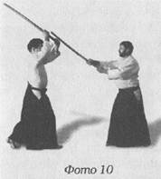 Боккен - это деревянная копия катаны, традиционного японского меча, который обычно держат двумя руками и который может только рубить или пронзать. Используя боккен, важно найти правильную позицию «ханми» и научиться достигать «треугольной позиции» (см. фото 10, 11). Чтобы научиться применять принципы объединения сознания и тела, применяя боккен, мастер Тохеи предлагает пять принципов, позволяющих в полной мере использовать силу полного расслабления.