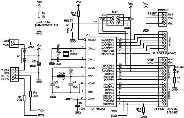 Конструкція Duino - подібних пристроїв надзвичайно проста. Схема MK-duino: Лінії Rx_PC, Tx_PC підключаються до мікросхеми USB-моста та мають інверсну полярність відносно відповідних сигналів на RS-232. Деякі моделі процесорів ATmega “шумлять” по лінії прийому при “підвішаному” виводі процесора 2-RXD. Тому може знадобитись установка резистора 100KΩ між цим виводом та заземленням. Перетворювач інтерфейсу RS-232 для MK-duino. Перетворювач монтується на плату лише за відсутності кабеля-перехідника USB-моста від мобільного телефону, і реальної необхідності використання інтерфейсу RS-232. Перетворювач здійснює інверсію і перетворення рівнів сигналів послідовного інтерфейсу: 0/5V - +12 V/-12V.