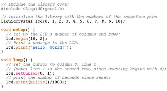 Схема обриву ІЧ-променя: Сигнал обриву ІЧ-променя йде на 2-ий цифровий контакт Arduino. Це перериває Arduino, що дозволяє йому зарахувати імпульс і дозволяє тахометру отримувати дані. Arduino LCD бібліотека: Для цього проекту використовувалась Arduino LCD бібліотека. В основному буде просто оновлення значення RPM на другому рядку на нове. В якості підготовки, подивіться на код наведений нижче, в якому за допомогою цієї бібліотеки на РК-дисплей виводитися "Hello, World!" У тахометрі будло використано схожий код, особливо: "lcd.print (millis () / 1000);".