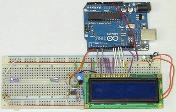 Метою даного проекту є створення системи з одним входом і одним виходом. На вході пристрою присутній сигнал, що змінюється з високого (+5 В) на низький (+0 В) рівень при порушенні зв'язку. Згідно цьому сигналу, Arduino збільшуватиме значення внутрішнього лічильника. Потім проводитися додаткова обробка і розрахунок, і по перериванню тригера на РК-дисплей виводитиметься розраховане RPM. Для зв'язку ми будемо використовувати ІЧ-промінь від ІК- світлодіода, включеного через низько-омний резистор так, щоб світитвся яскраво. Як приймач ми будемо використовувати фототранзистор, який за відсутності світла ІЧ-світлодіода "закривається". Комп'ютерний вентилятор буде розміщений між ІЧ-передавачем і приймачем і включений. ІЧ-приймач включений через транзисторну схему, буде генерувати переривання. Для виведення результату буде використовуватися Arduino LCD інтерфейс, буде виводитись остаточне значення RPM на РК-дисплей. Елементи: Arduino UNO 16x2 LCD макетна плата Регулюючий резистор 5 кОм перемички SIP роз'єми 2x 2N2222 NPN транзистор інфрачервоний світлодіод фототранзистор Резистор 10 Ом Резистор 100 кОм Резистор 15 кОм або 16 кОм Комп'ютерний вентилятор