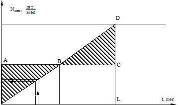 Это соотношение соответствует равномерному, т.е. пропорциональному времени освоения, нарастанию месячного выпуска изделий (рис.1). Очевидно, что общее количество изделий, изготовленных за период освоения t осв (т. е. N осв) равно площади треугольника ODL, а также площади прямоугольника OACL (т.к. BC есть средняя линия треугольникаODL ). Поскольку фигура ОВСL принадлежит как треугольникуODL, так и прямоугольнику OACL,то, следовательно, площади треугольников OAB иВDС равны между собой. Среднемесячный выпуск изделий за время D = t 2 – t 1 будет равен средней величине N мес1 и N мес2, т.е.