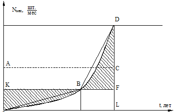 Графически этот случай представлен на рис. 2. Он соответствует неравномерному в период освоения нарастанию месячного выпуска – замедленному в начале и ускоренному в конце периода освоения. Площадь под кривой OBD (т. е. фигуры OBDL), как и площадь прямоугольника OKFL, равна общему количеству изделий N осв, т. e. SOBDL = SOKFL. А поскольку фигура OBFL является общей для каждой из этих фигур, то, следовательно, площади заштрихованных фигур ОКВ и ВDF также равны между собой. Уравнение кривой ОB неизвестно, поэтому воспользуемся линейной аппроксимацией: участки кривой OВ и BD заменим соответствующими отрезками. Абсцисса точки В (т. е. величина отрезка ОЕ на оси t) определяется из равенства площадей треугольников ОКB и BDF: