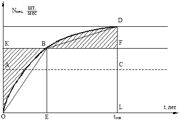 Графически этот случай показан на рис. 3. Он соответствует неравномерному во времени нарастанию месячного выпуска - интенсивному в начале периода, замедленному в его конце. Количество изделий(N осв), изготовленных за период t осв , соответствует площади под кривой ОВD, т. е. фигуры OBDL, а также площади прямоугольника OKFL. поскольку для них фигура OBFL является общей, то, следовательно, площади заштрихованных фигур ОКВ и ВDF равны между собой. Дальнейшие рассуждения полностью аналогичны случаю2, положение точки Е на оси t определяется по той же формуле, что и для случая 2 (см. формулу 7). Суммарная трудоемкость изделий Т сум , изготовленных за период освоения: