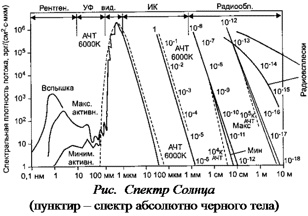 Видимое излучение Солнца имеет почти постоянную интенсивность, называемую солнечной постоянной. Спектр электромагнитного излучения Солнца – сплошной (во всех диапазонах), и наблюдения проводят всеми астрономическими методами (разного типа телескопами).
