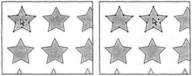 Группы могут вкладываться друг в друга, то есть объединяться с другими объектами или группами для образования новой группы большего размера. 1 Не отменяя выделение группы, состоящей из трех объектов верхнего ряда, удерживайте нажатой клавишу Shift| и щелкните мышью на первой слева звезде второго ряда. После расширения выделения выберите в меню команду Object ♦ Group (Объект* Группировать). В результате ограничивающая рамка расширится и захватит новый объект, при этом активированными окажутся точки привязки только левой звезды. 2 Удерживайте нажатой клавишу Shift и щелкните мышью на средней звезде второго ряда, а затем еще раз выберите в меню команду Object ♦ Group (Объекг ♦ Группировать). Повторите эти действия и для третьего объекта этого же ряда. 3 По окончании выберите в меню команду Select ♦ Deselect (Выделение * Отменить выделение), Вы только что создали вложенную группу. Можно сказать, что одна группа расположена внутри другой. Этот общепринятый метод при подготовке иллюстраций, 4 Выберите инструмент Selection (Выделение) и щелкните мышью на любой, входящей в группу звезде. Все объекты группы станут выделенными. 5 Отмените выделение объектов, щелкнув мьшыо на свободной области экрана. 6 Щелкните мышью на инструменте Direct Selection (Прямое выделение) в, не отпуская левой кнопки мыши, выберите путем перетаскивания указателя мыши в правую сторону инструмент Group Selection {Групповое выделение). 7 Щелкните мышью на левой верхней звезде в рисунке. В результате выделенным окажется только сам этот объект. Щелкните еще раз, и активной станет исходная группа, состоящая из фигур верхнего ряда. Если продолжать щелкать мышью, выделению будут подвергаться все созданные ранее отдельные группы.