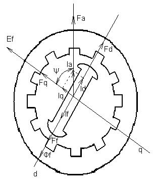 Если синхронная машина (СМ) имеет ненасыщенную магнитную систему, то можно принимать допущения о том, что магнитное сопротивление имеет лишь одну составляющую – сопротивление воздушного зазора. В этом случае магнитная цепь синхронной машины (СМ) можно считать линейной, и основное магнитное поле можно представить в виде суммы двух полей. На рисунке направление намагничивающей силы обмотки возбуждения Ff и потока обмотки возбуждения Фf совпадает с осью полюсов d и определяется током обмотки возбуждения If. ЭДС обмотки возбуждения Еf, индуктированная в обмотке якоря полем обмотки возбуждения, как всегда отстает от соответствующего потока Фf на 90°. Намагничивающая сила якоря Fa совпадает по направлению с током якоря Ia и зависит от величины и рода нагрузки, на которую включена синхронная машина (СМ). В зависимости от нагрузки угол