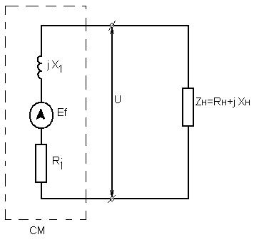 В неявнополюсной синхронной машине (СМ) разницы между продольными и поперечными осями нет, так как зазор между статором и ротором по всей окружности одинаковый. Поэтому токи и намагничивающая сила на составляющие по осям не раскладываются. Векторная диаграмма и схема замещения для рассматриваемого случая имеют следующий вид: