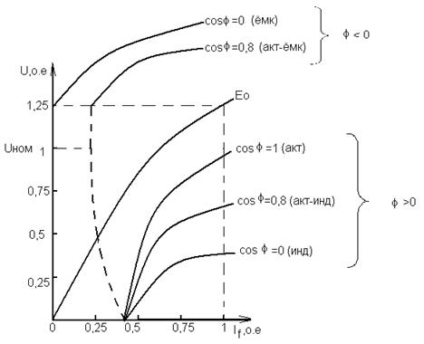 Регулировочные характеристики. Регулировочная характеристика – есть зависимость тока в обмотке возбуждения синхронного генератора (СГ) от его тока нагрузки Ia, при поддержании постоянства выходного напряжения (U=const), f1=const, n=const, cos Для поддержания постоянного напряжения, при возрастании индуктивной нагрузки, требуется увеличение тока в обмотке возбуждения If, а при возрастании емкостной нагрузки – уменьшение If.