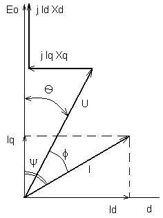 При работе генератора под нагрузкой, его режим определяется следующими величинами: 1. напряжением в сети (U); 2. собственной ЭДС генератора (Ео); 3. углом
