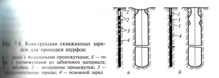 Взрывной способ проходки шурфов может быть применен в мягких легко-взрываемых породах - глинах, суглинках, супесях и лессах. При этом способе при взрыве удлиненного заряда, размещенного в скважине, в результате деформации пород образуется цилиндрическая полость – шурф. В верхней части выработки, как правило, образуется воронка выброса.