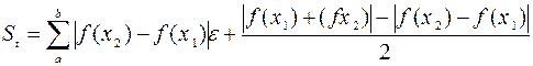 По методам трапеций и средних прямоугольников соответственно интеграл равен сумме площадей прямоугольных трапеций, где основание трапеции какая-либо малая величина (точность), и сумма площадей прямоугольников, где основание прямоугольника какая-либо малая величина (точность), а высота определяется по точке пересечения верхнего основания прямоугольника, которое график функции должен пересекать в середине. Соответственно получаем формулы площадей — для метода трапеций:
