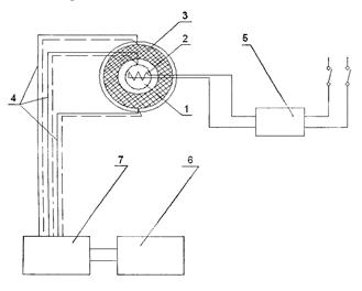 Рисунок 2.1 – Экспериментальная установка: 1- исследуемая изоляция; 2 – сферическая камера; 3 – нагреватель нихромовый; 4 – термопары “медь-константан”; 5 – проводка термопар; 6 – преобразователь; 7 – компьютер; 8 – блок питания.