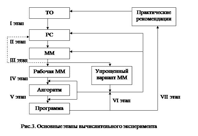 Использование обычных теоретических методов исследования современных технических, экологических, экономических и иных систем, не позволяет достичь требуемых в настоящее время полноты и точности результатов. Прямой натурный эксперимент над ними долог, дорог, часто либо опасен, либо попросту невозможен. Цена ошибок и просчетов в обращении с ними недопустимо высока. Поэтому компьютерное исследование математических моделей систем с привлечением современных средств вычислительной техники стало основным и наиболее эффективным методом исследования систем. Поскольку такое изучение математической модели можно рассматривать как проведение эксперимента на ЭВМ, то в современной научно-технической литературе термин “вычислительный эксперимент” часто выступает как синоним термина “математическое моделирование”. Последовательность проведения отдельных этапов общей процедуры вычислительного эксперимента над моделью технического объекта можно представить следующей обобщенной схемой: