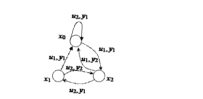 Если в автомат, находящийся в состоянии x 0, поступает входной сигнал u 1, то выходной сигнал будет y 1,а состояние изменится на x 2. На пересечениях строк и столбцов таблица переходов находятся значения функции переходов, а на пересечении строк и столбцов матрицы выходов – значения функции выходов. Автомат может быть описан при помощи ориентированного графа: состояниям автомата соответствуют вершины графа, а стрелки (i, j) показывают переход из состояния xi всостояние xj ,под влиянием входного сигнала u. Соответствующие сигналы (входные и выходные) записываются вдоль стрелок графа. На следующем рисунке представлен граф для автомата, заданного выше таблицами переходов и выходов.
