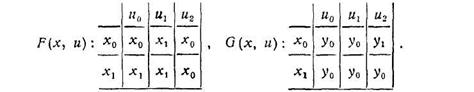 Пример 2. Если нас интересует более детально устройство самого турникета (т.е. системой является турникет), то придется учесть, что входными воздействиями (сигналами) для него являются опускание пятака и прохождение человека через турникет. Таким образом, система имеет два входа, каждый из которых может принимать два значения («есть» или «нет»). Пренебрегая возможностью одновременного опускания жетона и прохождения, вводим три значения входа: и 0– «нет воздействия», и 1– «опускание жетона», и 2–«прохождение». Множество Y можно задать так же, как и в примере 1. Однако теперь значение выхода y (t)не определяется только значением входа u (t), а зависит еще и оттого, был ли опущен жетон раньше, т. е. от значений u (s)при s < t. Система имеет «память». Простейший тип ММ для описания дискретных систем с памятью – это конечный автомат. Для его построения вводится конечное множество внутренних состояний системы X, определяющее «память». В данном случае в X достаточно включить два элемента: Х 0– «жетон не был брошен», Х 1– «жетон был брошен». Значения состояния системы в следующий момент времени и выхода в текущий момент зависят от текущих значений состояния и входа, т. е. x (k+ 1) =F (x (k), u (k)), y (k) =G (x (k), u (k)), где k –номер момента времени такта. Функцию переходов F (х,и)и функцию выходов G (x, и)можно задать таблично: