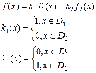 Так как коэффициенты k 1(x) и k 2(x) кусочно-постоянные функции, то их можно представить в виде конечного автомата. У этого автомата два состояния: D 1и D 2, выходные символы { k 1=l, k 2=0} для состояния D 1и { k 1=0, k 2=1}для состояния D 2, а входными символами являются два сигнала, говорящие о достижении границы областей D 1 и D 2. Состояние D 1помечено как начальное.