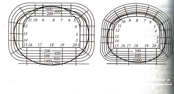 а б При проведении выработок с длительным сроком службы, необходимо получить контур выработки, близкий к проектному с возможно меньшим нарушением законтурного массива, применяют способ контурного взрывания, при котором используют последующее или предварительное щелеобразование. При предварительном щелеобразовании шпуры по контуру выработки взрывают в первую очередь для образования контурной щели. Взрывание зарядов в центральной части выработки происходит с экранированированием энергии волн напряжений щелью, что значительно ослабляет действие взрыва на стенки и кровлю. Предварительное щелеобразование широко применяют при проведении выработок обычного сечения. Минимального нарушения законтурного массива достигают следующими способами: - взрыванием оконтуривающих шпуров рассредоточенными зарядами, взрыванием оконтуривающих шпуров сплошными зарядами малого диаметра; - сближением оконтуривающих шпуров в трудно взрываемых крепких породах; - применением специальных вкладышей в оконтуривающих шпурах со стороны стенок выработки. Заряды оконтуривающих шпуров взрывают после взрыва предконтурных зарядов. Контурное взрывание с предварительным щелеобразованием применяют при проведении выработок большой площади сечения, чего по контуру выработки шпуры на расстоянии 20...40 см один от другого заряжают зарядами малого диаметра. Этот метод можно применять там, где допустимо отставание крепи от забоя, поочередное взрывание оконтуривающих шпуров часто приводит к разрушению крепи выработки. Недостатками контурного взрывания являются: - увеличение и шпуров на 15...20 %; - рост затрат труда на заряжание оконтуриваших шпуров из-за сложности конструкции зарядов. При применении последующего щелеобразования (гладкое взрывание) одновременно взрывают сближенные заряды особой конструкции по контуру горной выработки. Конструкция зарядов должна обеспечивать максимально возможное ослабление действия взрыва в сторону охраняемого массива. Достигают этого: - применением рассредоточенных зарядов; - применением низкобризантных ВВ; - применением патронов ВВ уменьшенногой диаметра с продольной кумулятивной полостью, обращенной в сторону ядра выработки; - зарядов, у которых со стороны законтурного массива уложены продольные деревянные планки. Основными факторами, оказывающими влияние на качество оконтуривания выработки, являются: - величина заряда; - диаметр заряда; - конструкция заряда; - расстояние между оконтуривающими шпурами; - л.н.с. При взрыве вокруг каждого шпурового заряда образуется цилиндрическое поле напряжений. Через некоторый промежуток времени происходит взаимодействие полей напряжений соседних зарядов, вследствие этого повышается концентрация напряжений по линии размещения зарядов. Волна сжатия от взрыва оконтуривающих шпуров, достигая открытой поверхности, образованной взрывом зарядов врубовых и отбойных шпуров, отражается от нее. Отраженная волна, распространяясь вглубь массива, может привести к значительному разрушению законтурной части массива. В результате повышения концентрации напряжений по линии оконтуриваюших зарядов образуется трещина, которая препятствует распространению отраженных волн в законтурное пространство. Таким образом, разрушение законтурной части массива снижается, если к момен